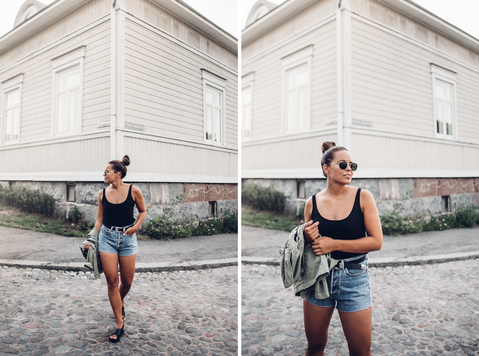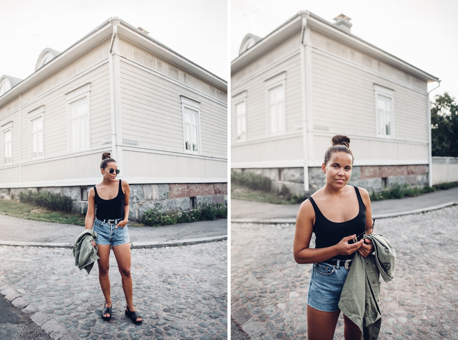 toppi Bershka // shortsit Levi’s // sandaalit Timberland // takki Gina Tricot