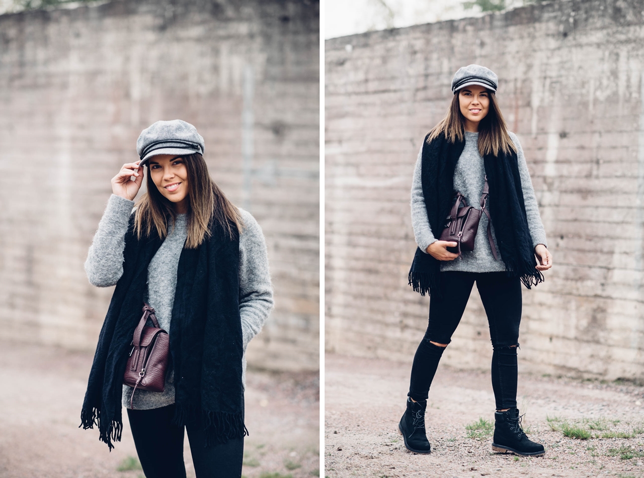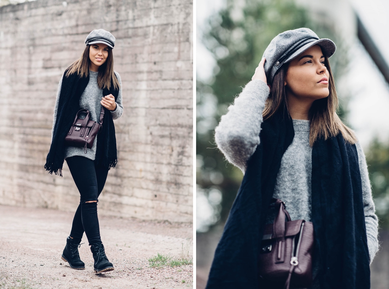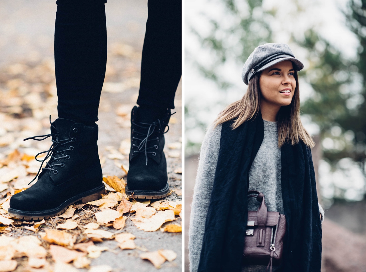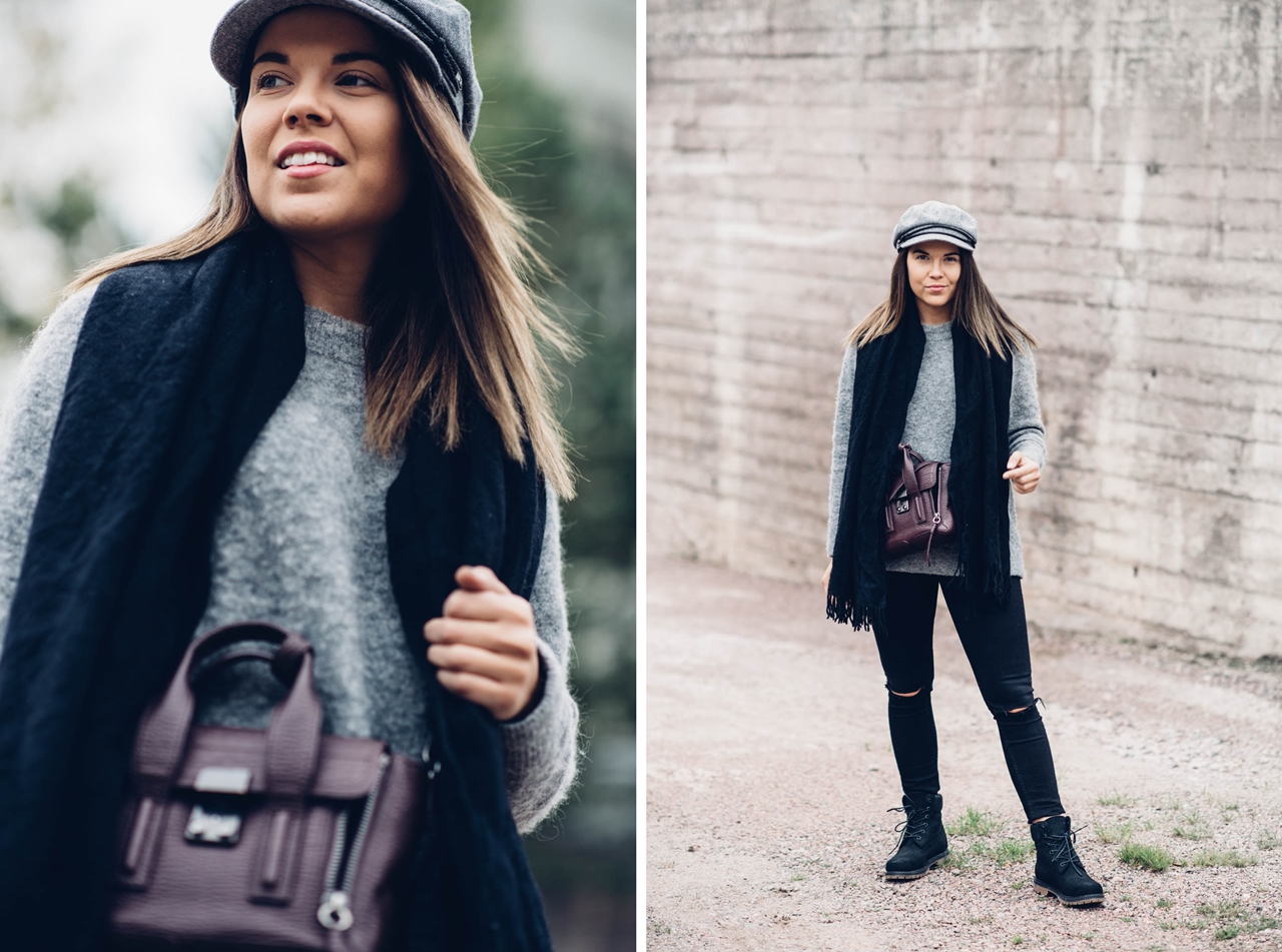 neule Samsoe & Samsoe // farkut Tiger of Sweden // laukku Phillip Lim // kengät Timberland // hattu Brixton