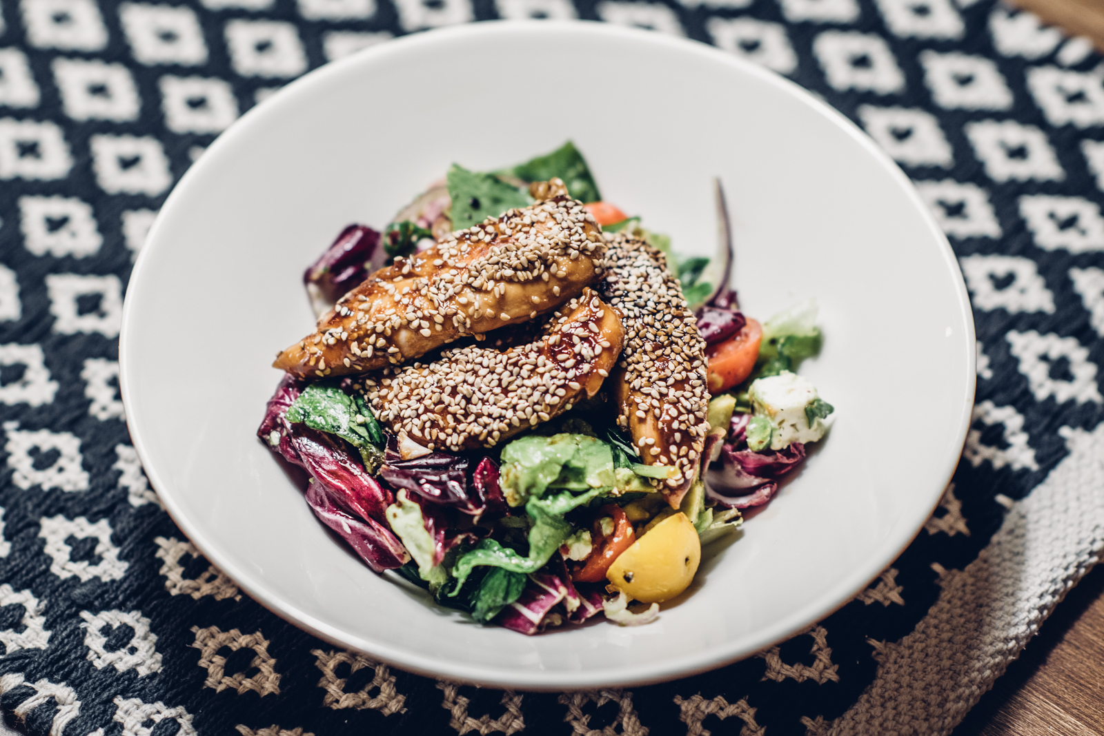Sekoita marinadin ainekset kulhossa keskenään, lisää kanan sisäfileet ja sekoita. Paista marinoidut kanapalat pannulla miedolla lämmöllä kypsiksi. Jätä kanat vetäytymään ja valmista haluamasi salaattipohja. Ripottele kanapalojen päälle sesaminsiemenet ennen tarjoilua.